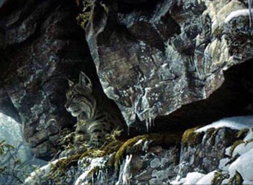 "Safely stationed in an imposing rock crevice, the bobcat keeps watch over its territory. Relying primarily on its sense of sight and hearing to pinpoint potential prey, the bobcat has chosen a sylvan spot on this mossy platform. A solitary animal, except during mating season, this rather small wild cat is quite aggressive, sometimes taking prey as large as deer. The bobcat is also highly adaptable, illustrated by its extensive North American range, and exploits a gamut of climates and terrains, including swamplands, forests, deserts and mountainous regions. At the Cliff is a painting that celebrates the diversity of texture: rock, lichen, moss, fern, ice, snow and, of course, fur, which, in itself, displays a variety of mottling and coloring. Aside from the variety of elements and surfaces that excite both the visual and tactile senses, I was particularly attracted by the sculptural qualities in this cliff face and by the interplay of triangular shapes I found there. At center, I placed the looming inverted rock wedge and carried the triangular theme throughout the elements of the painting; to this end, with its ruffs of fur extending downward from its ears to its jowls, the anatomy of the bobcat was obliging."