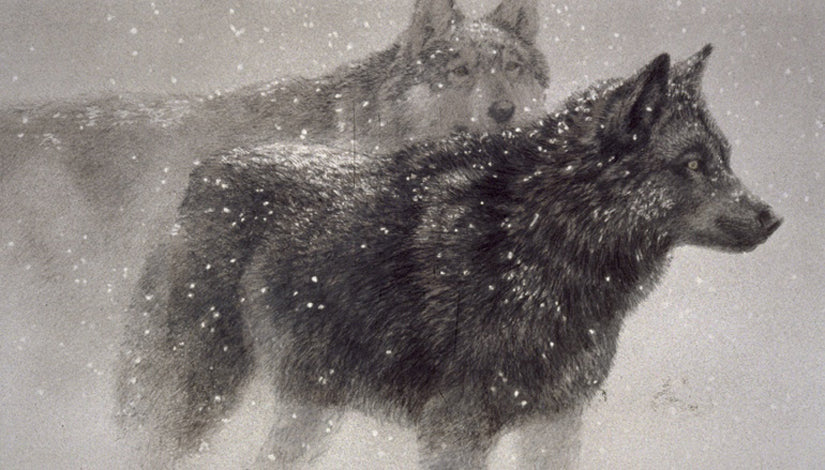 "A wolf pack moves across a frozen lake. In the snowy haze, only the closest two animals